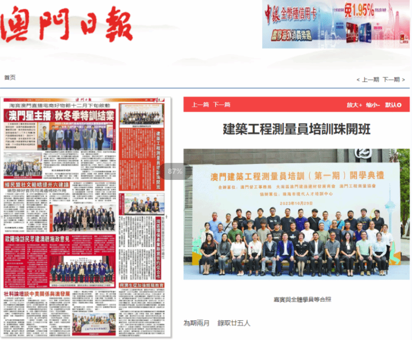 由澳门劳工事务局、大湾区澳门建造建材发展商会、澳门工程测量协会共同主办,公司和珠海市现代人才培训中心承办的“2023年第一期澳门建筑工程测量员培训课程”于10月29日开班,该培训班为期2个月。培训班得到了澳门建筑行业专业人员的积极响应,60多名学员报名培训,培训量达到1500人日,被澳门日报、直播广东、南方+等重要媒体报道。
